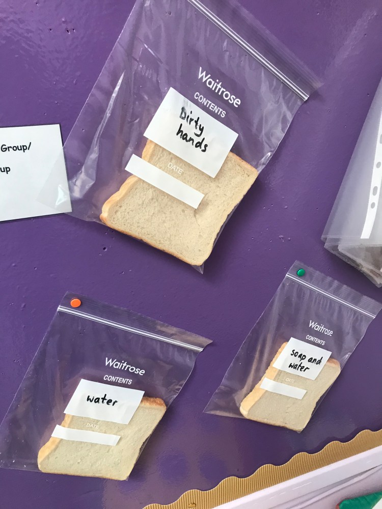In relation to the focus on the importance of hand washing that has happening of late, we carried out an experiment to test the effect of using soap when washing our hands. We handled a piece of bread without washing our hands, then another piece after washing our hands with only water and finally a piece after using soap and water. Watch this space for the results….