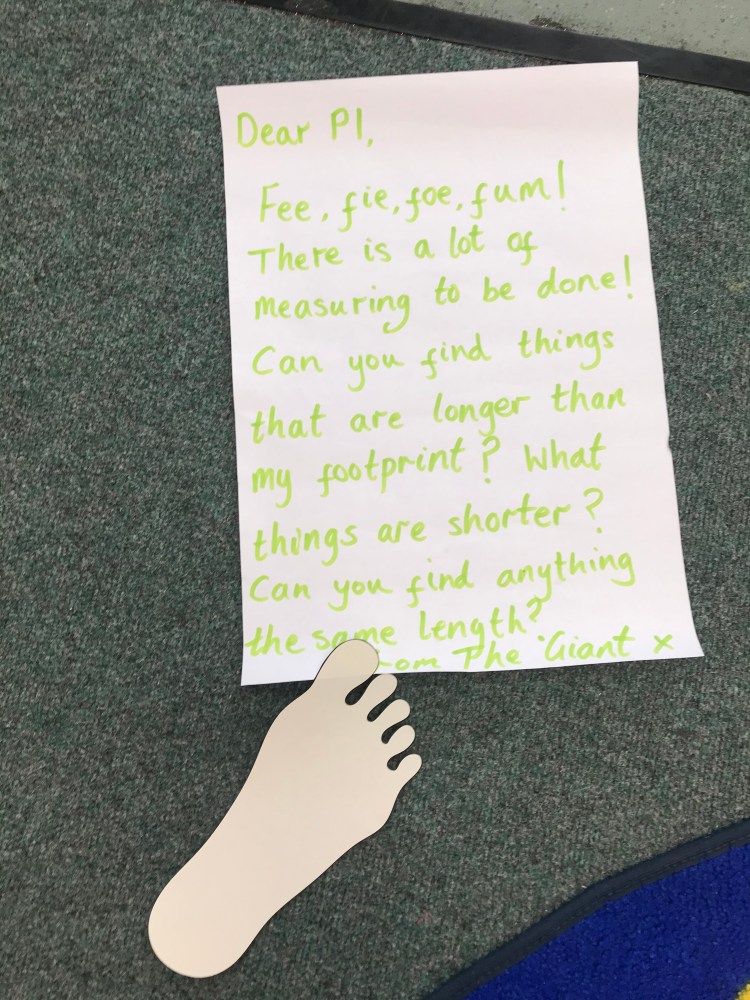 In Maths we were learning about measure. We had a mysterious letter from a friendly giant giving us some length challenges…